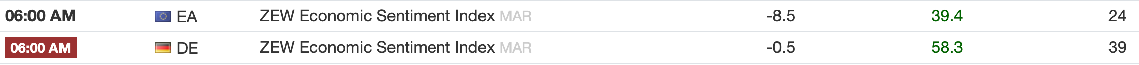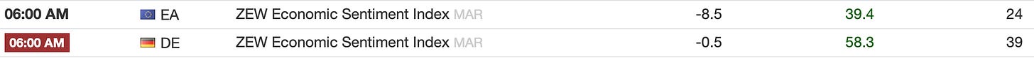 Which takes us back to, what is driving markets these days? Two and a half weeks into the war, I presume that margin calls have been settled and those positions adjusted or reduced accordingly. After all, margin clerks demand settlement immediately, not in two weeks’ time, so they are done. Economic data has been underwhelming, although we are beginning to see the first inklings of war-related weakness with yesterday’s Empire State Manufacturing disappointment (-0.2 vs 7.1 last month and 3.2 expected), but even more so with this morning’s German and European ZEW Economic Sentiment Indices.
